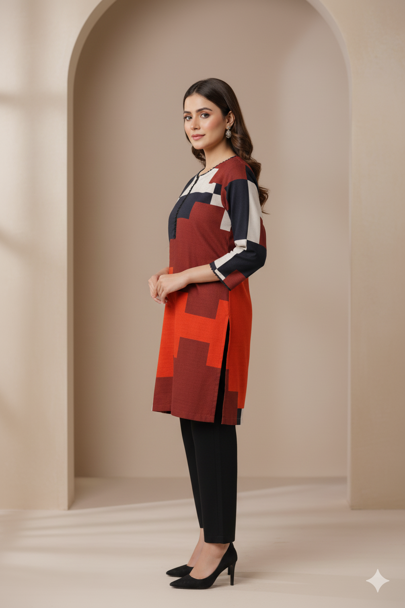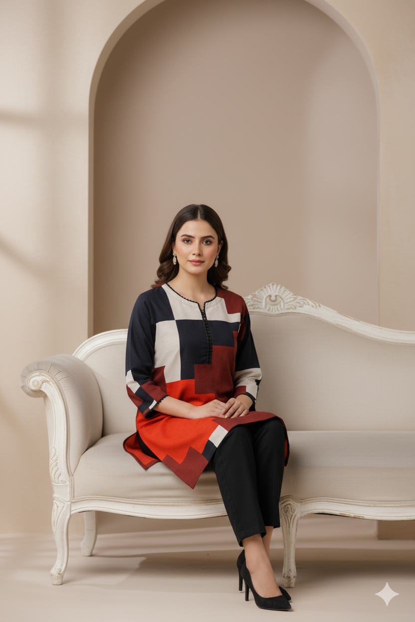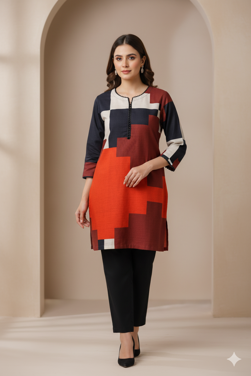 Step into Modern Sophistication with Crepe 2PC, a statement ensemble that blends contemporary design with timeless comfort. The rich geometric print in hues of rust, black, and ivory creates a bold yet graceful look—perfect for elevating your everyday wardrobe with effortless flair.