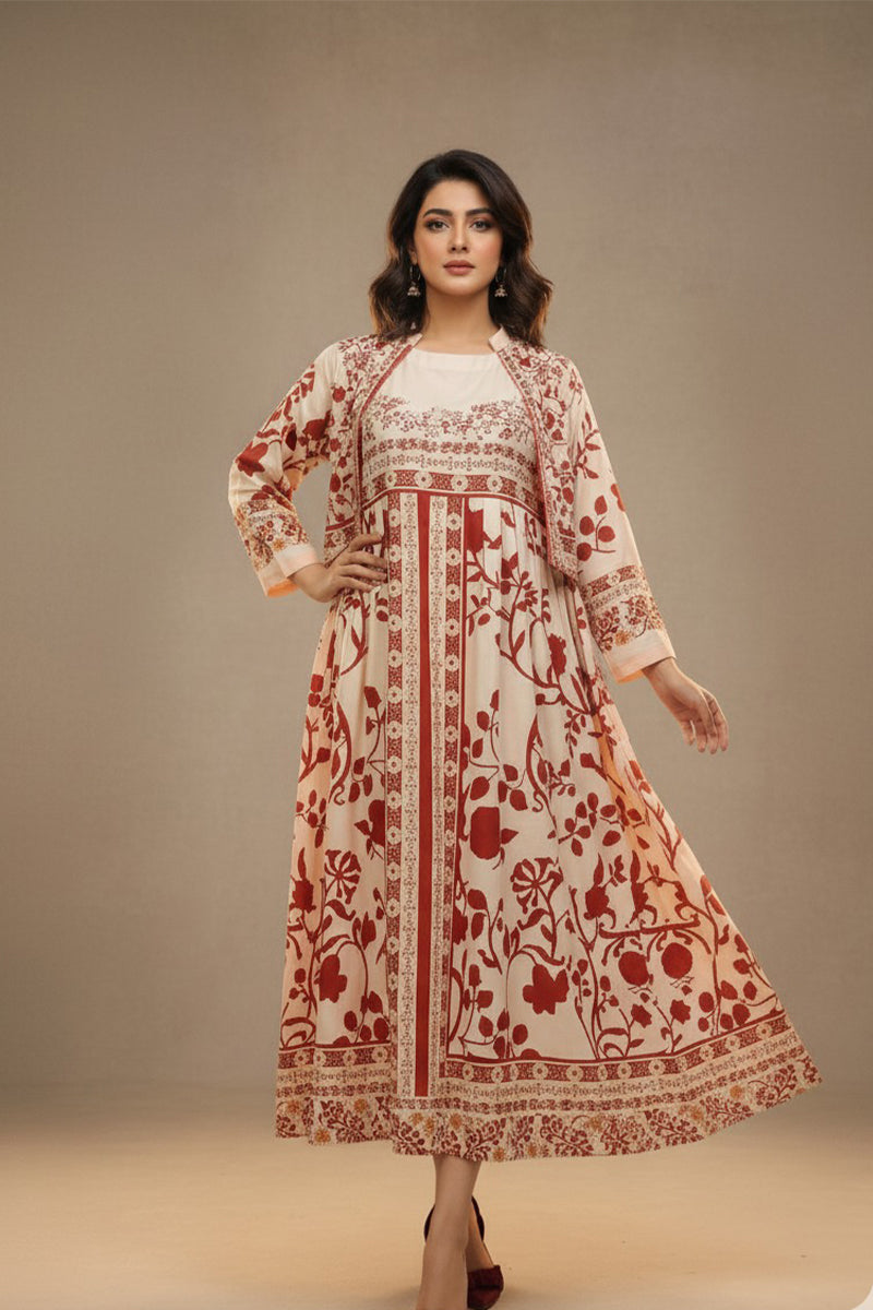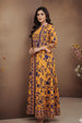 Grace meets tradition in this stunning Frock with koti, crafted from luxurious Korean crepe fabric. The mustard-yellow base adorned with deep blue floral motifs exudes timeless elegance, while the intricately printed koti adds a layer of sophistication. Its flowing silhouette and soft, breathable texture ensure both comfort and style, making it a perfect choice for festive occasions or semi-formal gatherings.