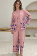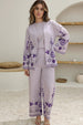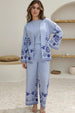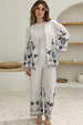 The set features a minimal yet graceful inner, paired with a flowy jacket adorned with delicate midnight-blue floral embroidery. Matching wide-leg trousers complete the look, carrying the same intricate embroidered patterns for a harmonious finish.
