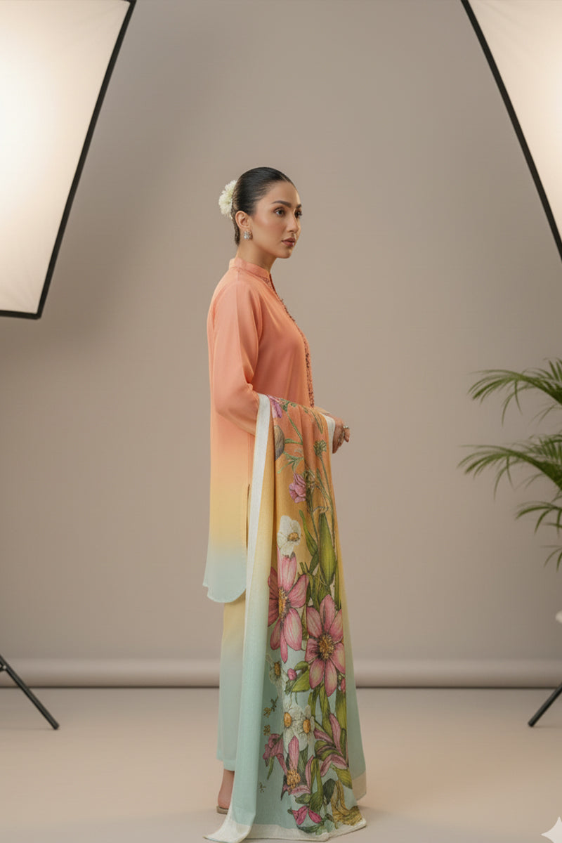 Details: Hand Embroidered Neckline | Ombré Design | Printed Floral Dupatta