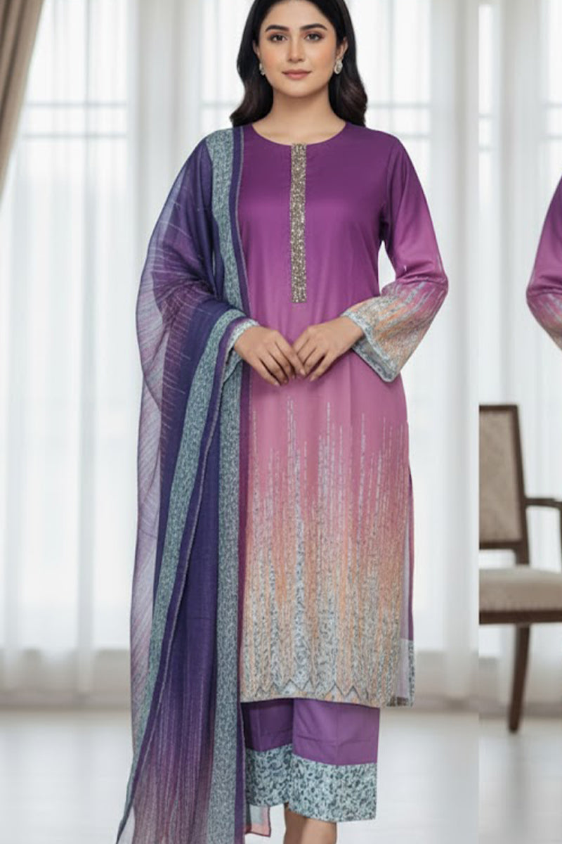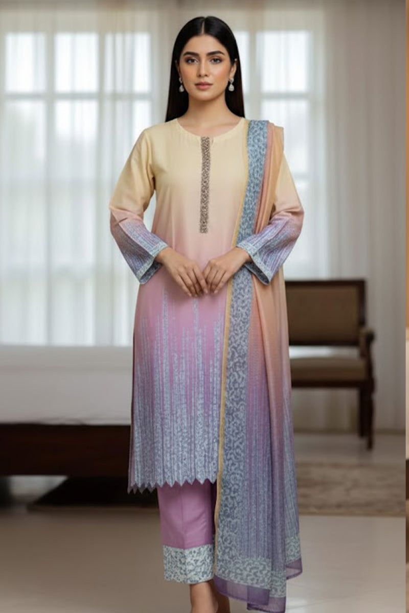 Ombre Effect: The shirt features a graceful ombre fade starting with a soft peach at the yoke and transitioning seamlessly into a vibrant pink and purple at the lower half.