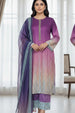 Ombre & Print: The accompanying silk dupatta is a visual masterpiece, displaying a dramatic ombre fade from soft peach/pink into deep lavender.