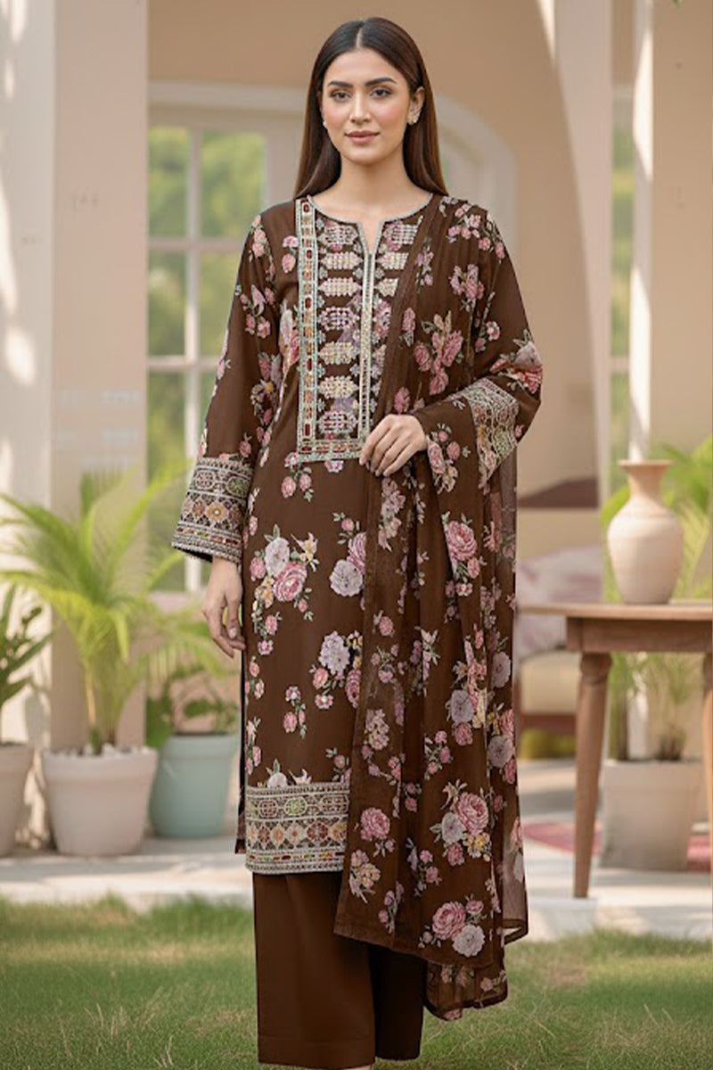 This 3-piece ensemble, Zarish Bloom, is a masterclass in blending traditional craftsmanship with contemporary elegance. Set against a deep, chocolate brown canvas of premium Silk Khaddar, this article is designed for those who appreciate sophisticated textures and intricate detailing.