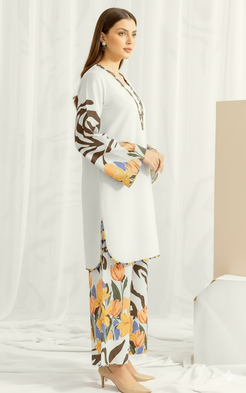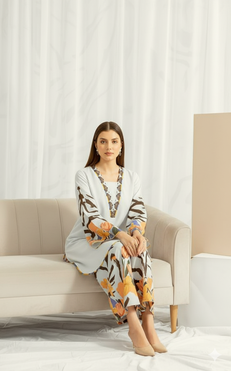 Step into the charm of the season with Zehn-e-Bahar, a stunning 2-piece khaddar outfit that blends grace with contemporary flair. The soft pastel base is elevated with vibrant floral artistry and bold abstract patterns, creating a perfect balance of freshness and sophistication.